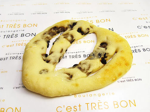 バゲットの生地にオリーブを包んで、薄くのばしさっと焼き上げました。